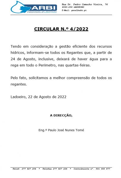 Tendo em consideração a gestão eficiente dos recursos hídricos, informam-se todos os Regantes que, a partir de 24 de Agosto, inclusive, deixará de haver água para a rega em todo o Perímetro, nas quartas-feiras.